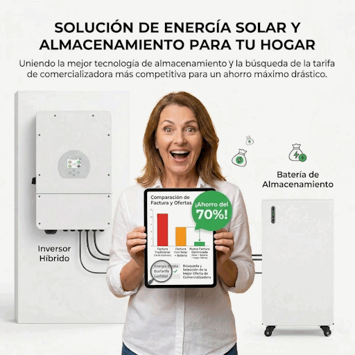 Una solución integral de autoconsumo solar para el hogar. Combina un inversor híbrido con un sistema de almacenamiento en batería para maximizar la eficiencia energética. La tableta muestra una optimización de tarifa que resulta en un ahorro drástico del 70% o más en la factura eléctrica, logrando así la independencia energética y la sostenibilidad.